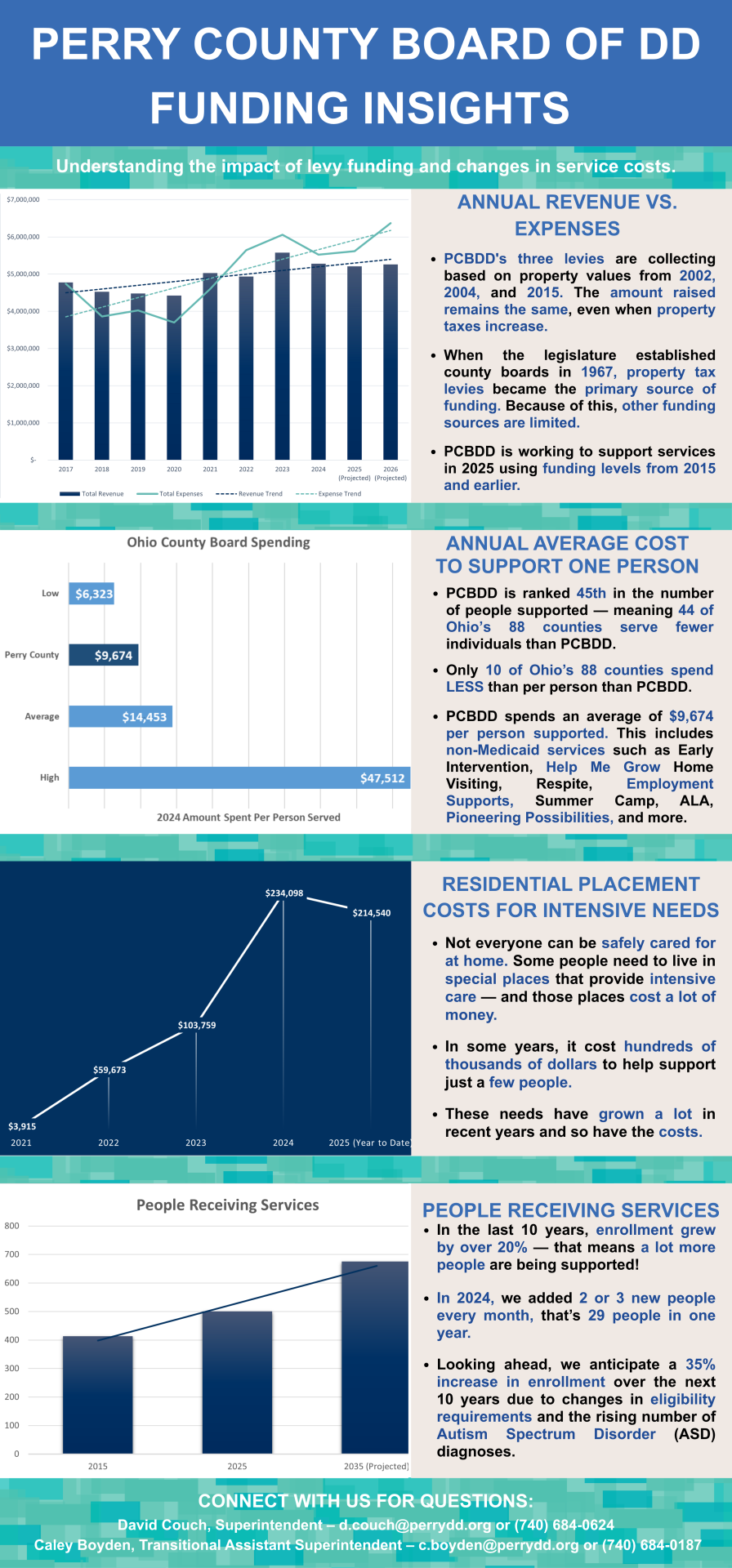 Revenues received by the Perry County Board of Developmental Disabilities (PCBDD) come from a combination of local, state, and federal sources. All services offered by PCBDD are provided at no cost, except as required by state rule.