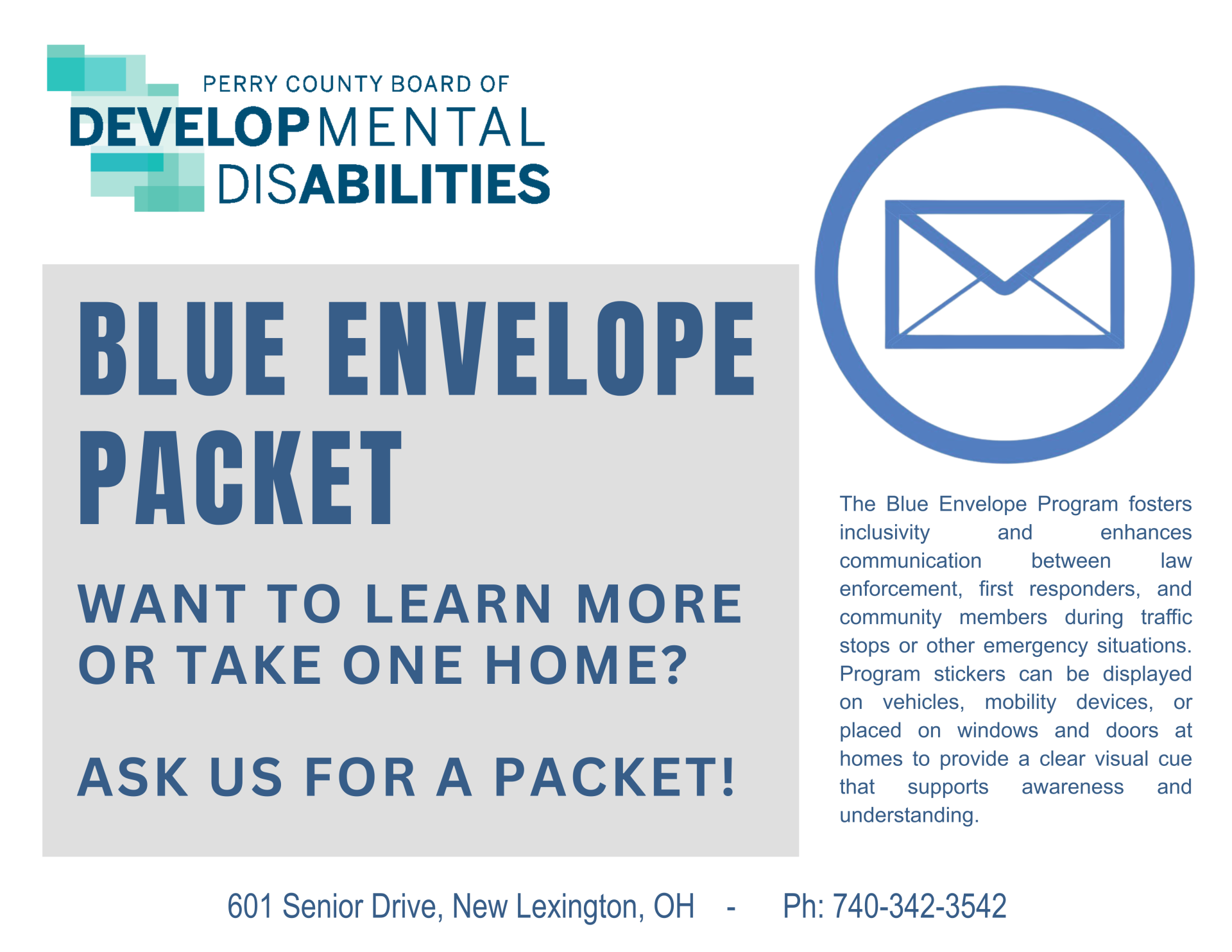 Ohio’s Blue Envelope Program works as a communication tool to assist drivers with developmental disabilities during interactions with police, firefighters, EMS and other emergency situations. This program is especially helpful for individuals with Autism, anxiety or other conditions that might require accommodations or awareness during a law enforcement interaction.