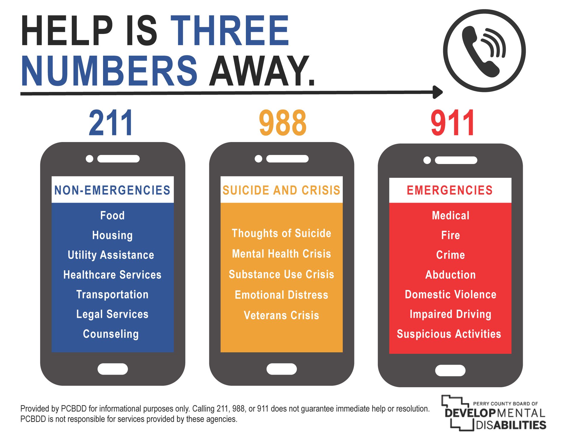 - 211 – Non-emergency community services (food, housing, healthcare, counseling)